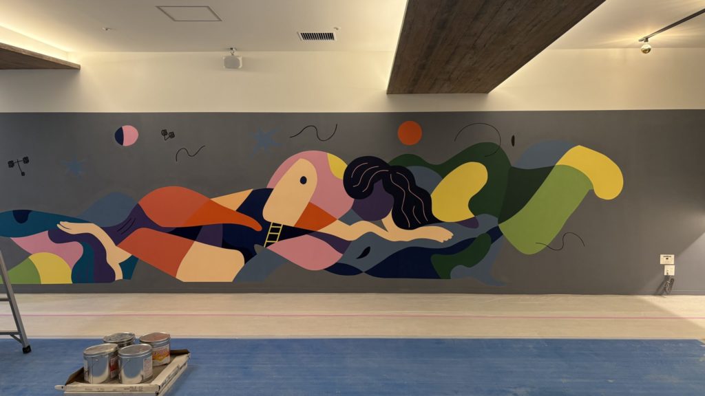 zen place pilates 京都西院 所在地 京都府京都市右京区西院東淳和院町1-1アフレ西院5F URL 種別 ・ピラティススタジオ内、壁画アート制作 サイズ(約) スタジオ内壁面:横18,000㎜×縦2,200㎜ 施工時期 2025年5月 制作期間 約3日程/2名
